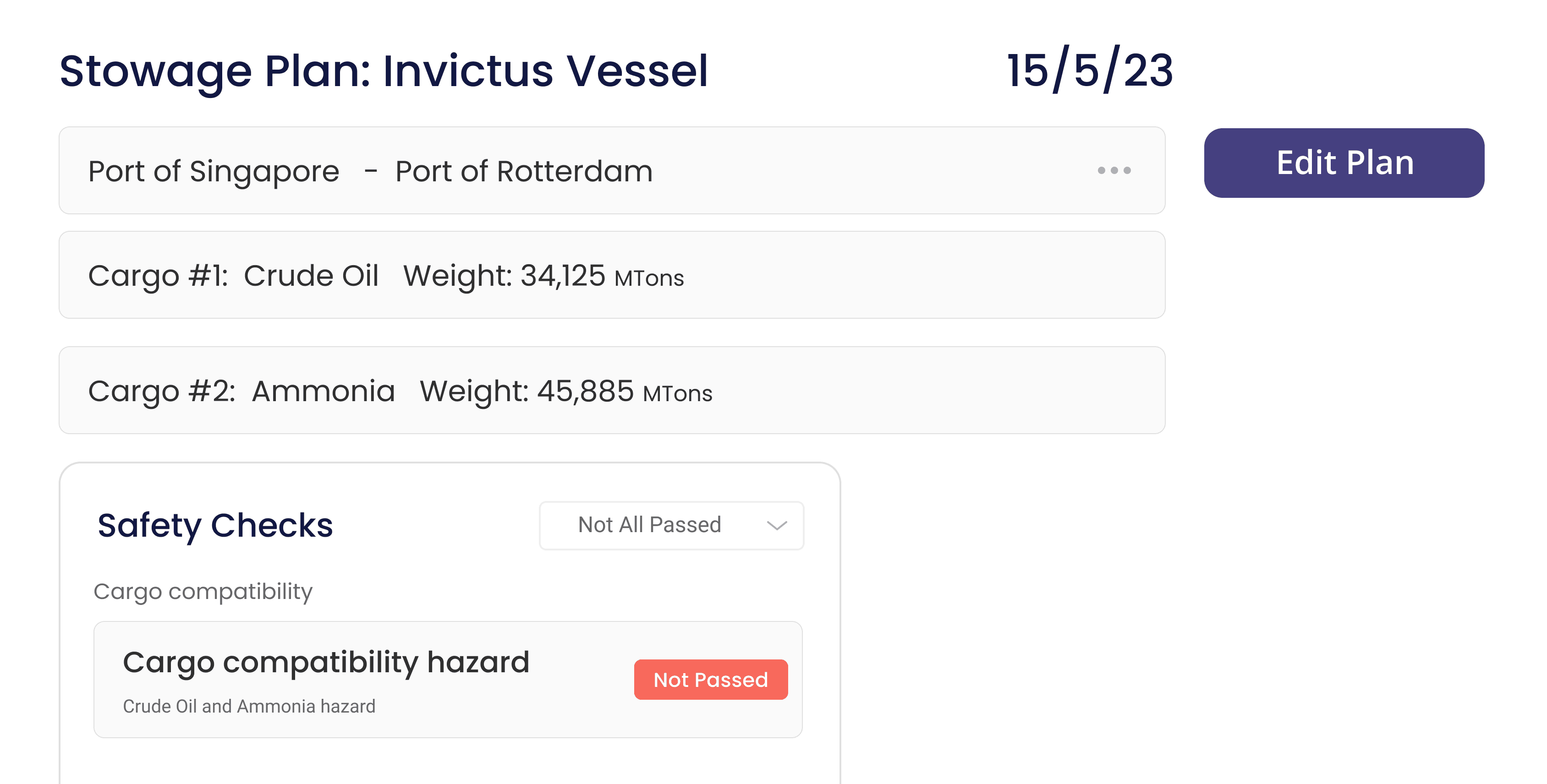 Our software incorporates industry regulations and guidelines, such as proper cargo segregation, balanced load distribution, and adherence to specific rules governing hazardous materials. This ensures that the generated stowage plans are compliant with applicable laws and minimize risks to crew, cargo, and the environment.
